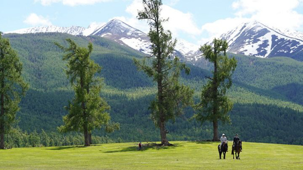 2024年6月4日,游客在新疆阿勒泰地区哈巴河县的草原上骑马游玩。